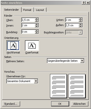 - Setzen Sie den Bundsteg auf "0" - wählen Sie Hochformat - und stellen Sie bei Seiten immer Gegenüberliegende Seiten ein.