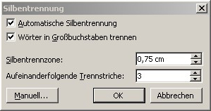 Zugunsten der besseren Lesbarkeit sollten Sie immer Blocksatz verwenden. Damit keine riesigen Lücken zwischen den Wörtern entstehen, sollten Sie unbedingt die Silbentrennung aktivieren. Auf Extras - Sprache - Silbentrennung können Sie diese Einstellungen vornehmen.