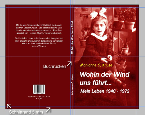 Wenn Sie Ihr Buchcover selbst gestalten wollen, dann achten Sie bitte darauf, dass auch ein Schnittrand angelegt werden muss. Dieser beträgt 5 mm an jeder Seite. Hat Ihr Buch die Maße 12 x 19 cm, so muss Ihre Covervorlage 12,5 x 20 cm ( Gesamtgröße 25 x 20 cm / Vorder- und Rückseite) haben - zuzüglich Buchrückenbreite. Diese ermittelt sich aus der Anzahl Ihrer Buchseiten.