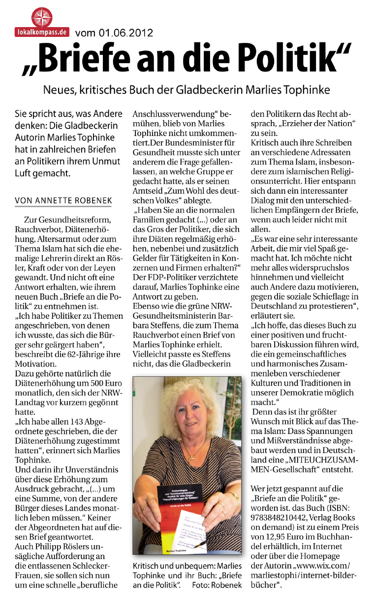 Sie spricht aus, was Andere denken: Die Gladbeckerin Autorin Marlies Tophinke hat in zahlreichen Briefen an Politikern ihrem Unmut Luft gemacht. Zur Gesundheitsreform, Rauchverbot, Diätenerhöhung, Altersarmut oder zum Thema Islam hat sich die ehemalige Lehrerin direkt an Rösler, Kraft oder von der Leyen gewandt. Und nicht oft eine Antwort erhalten, wie ihrem neuen Buch „Briefe an die Politik“ zu entnehmen ist. >> weiterlesen