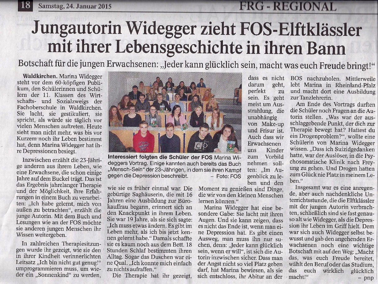 Marina Widegger, 21 Jahre jung, wurde in einer kleinen Stadt im November 1991 in Niederbayern geboren. Als sie mit bereits 19 Jahren wegen der Diagnose Depressionen beschloss, glücklich werden zu wollen, begab sie sich in die Spuren ihrer Kindheit zurück und begann, das Mensch-Sein zu erforschen, sich selbst kennenzulernen und vor allem: lieben zu lernen! Ihr Ehrgeiz und ihre Neugierde führten sie immer weiter zu den "Hintergründen" - zu sich selbst - und zu den "Geheimnissen" des Lebens.